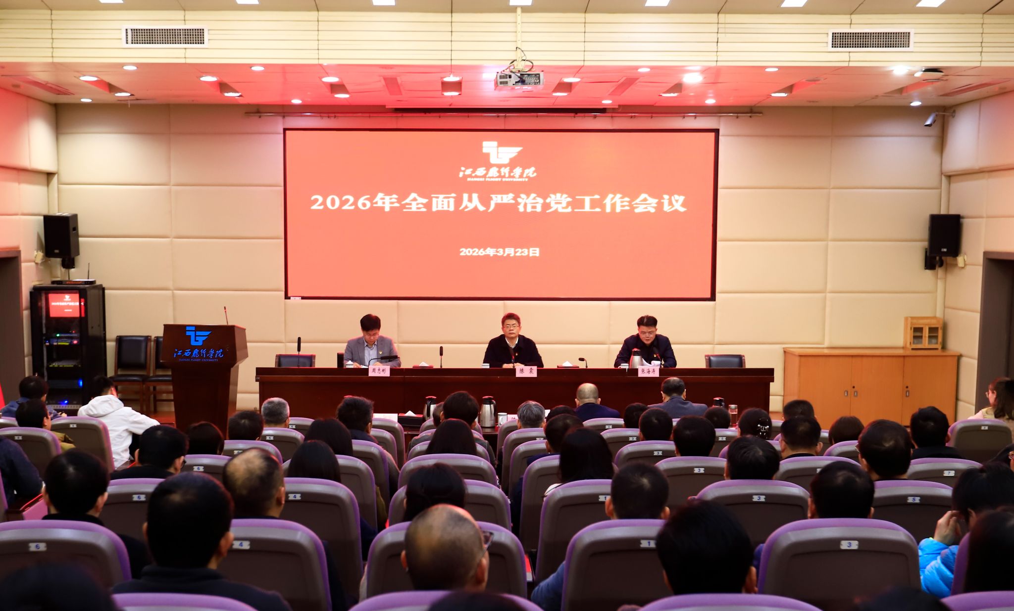 3月23日,学校召开2026年全面从严治党工作会议,总结2025年学校全面从严治党工作,分析当前形势,研究部署2026年工作任务。党委书记陈震出席会议并讲话,在家校领导、中层干部、各基层党组织纪检委员及校纪委全体同志参会,党委副书记张海涛主持会议。