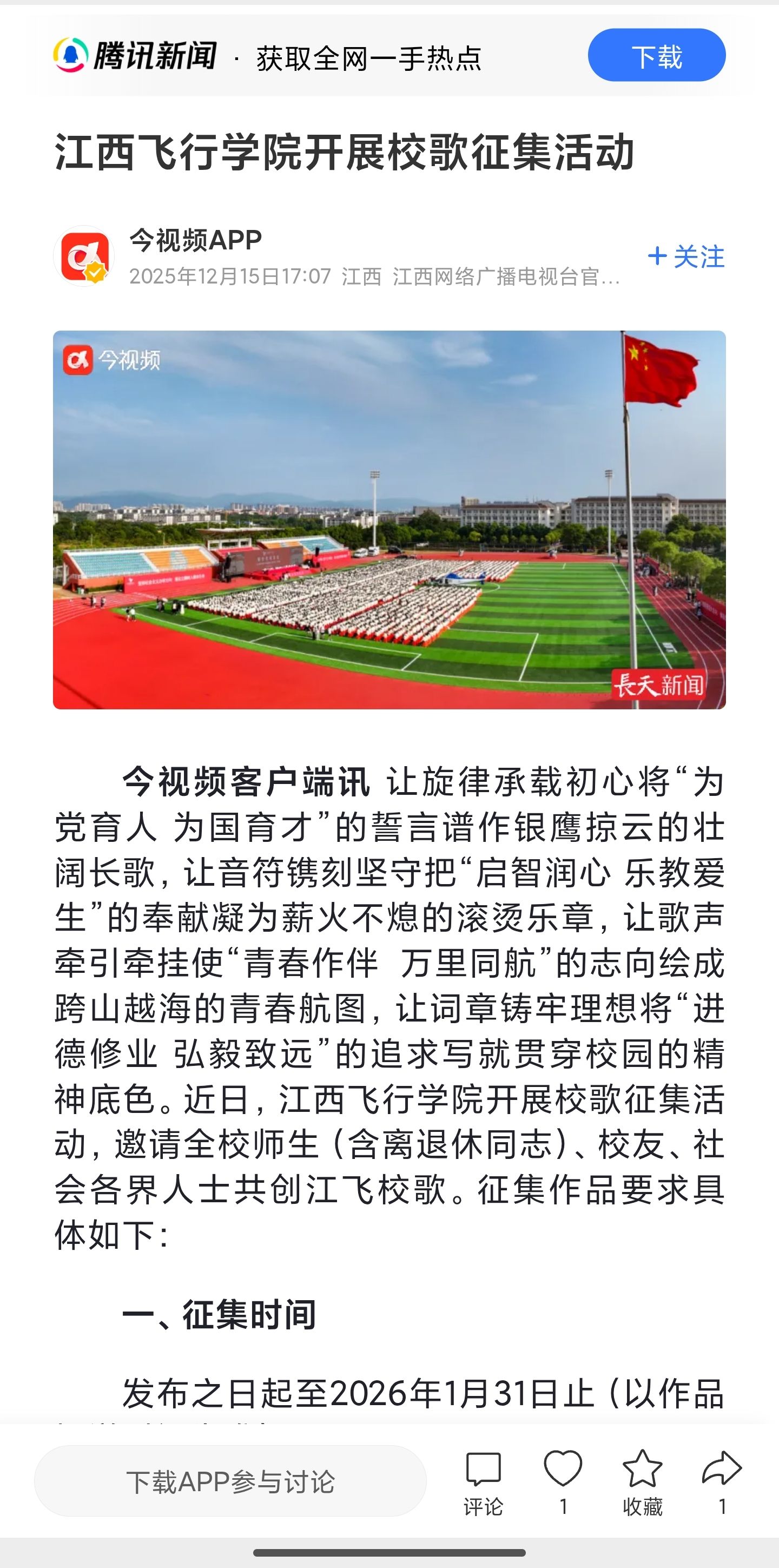 近日,腾讯网报道,江西飞行学院开展校歌征集活动详情如下